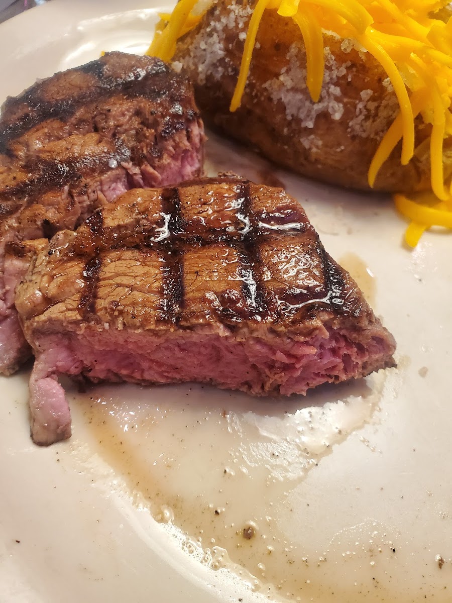 Relatively fast service even when really full. Consistently good food. Rolls and cinnamon butter are excellent. Fried catfish with loaded baked potato and house salad pictured. Steaks and seafood are great. Burgers are also great.